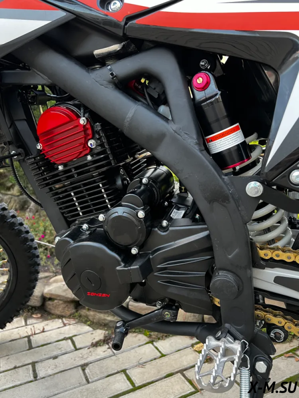 Оснащается Топовым оригинальным ZS 177FMN с высоким крутящим моментом в паре со спортивным карбюратором Nibbi Racing 30 идеально расположен внутри рамы. По сравнению с другими эндуро мотоциклами наклонен назад, это позволило распределить массу и получить лучшую управляемость.